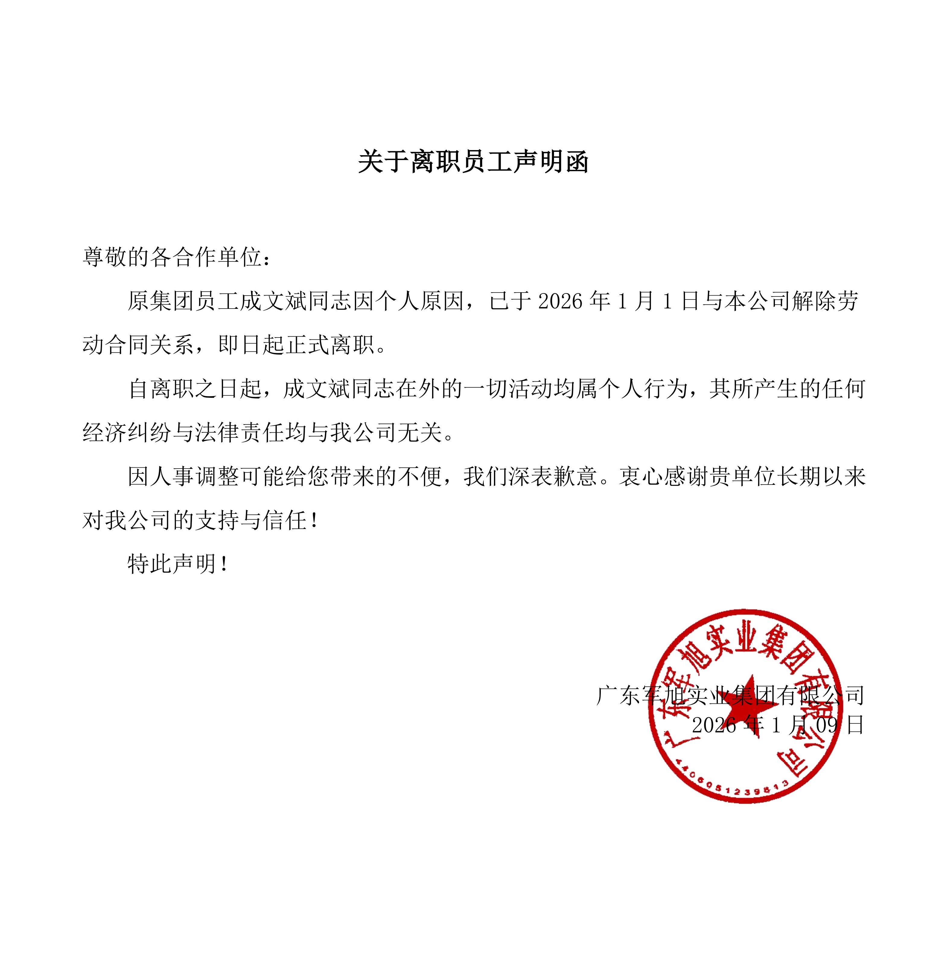 军旭集团关于免除成文斌同志职务的通知